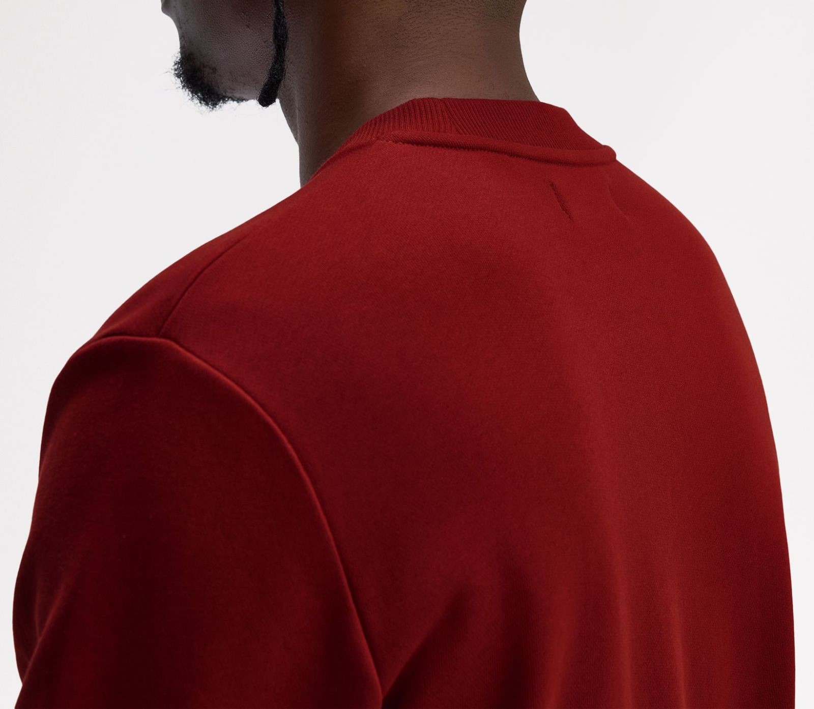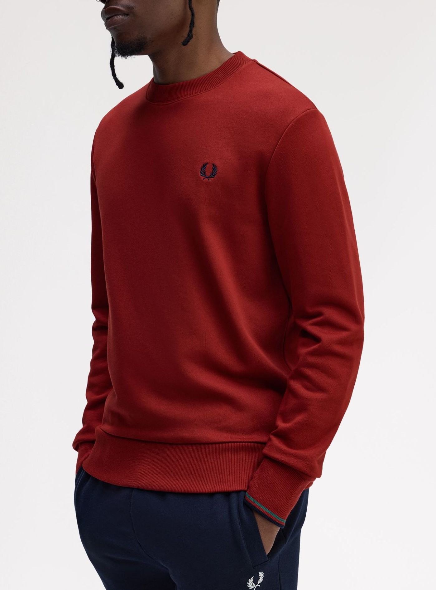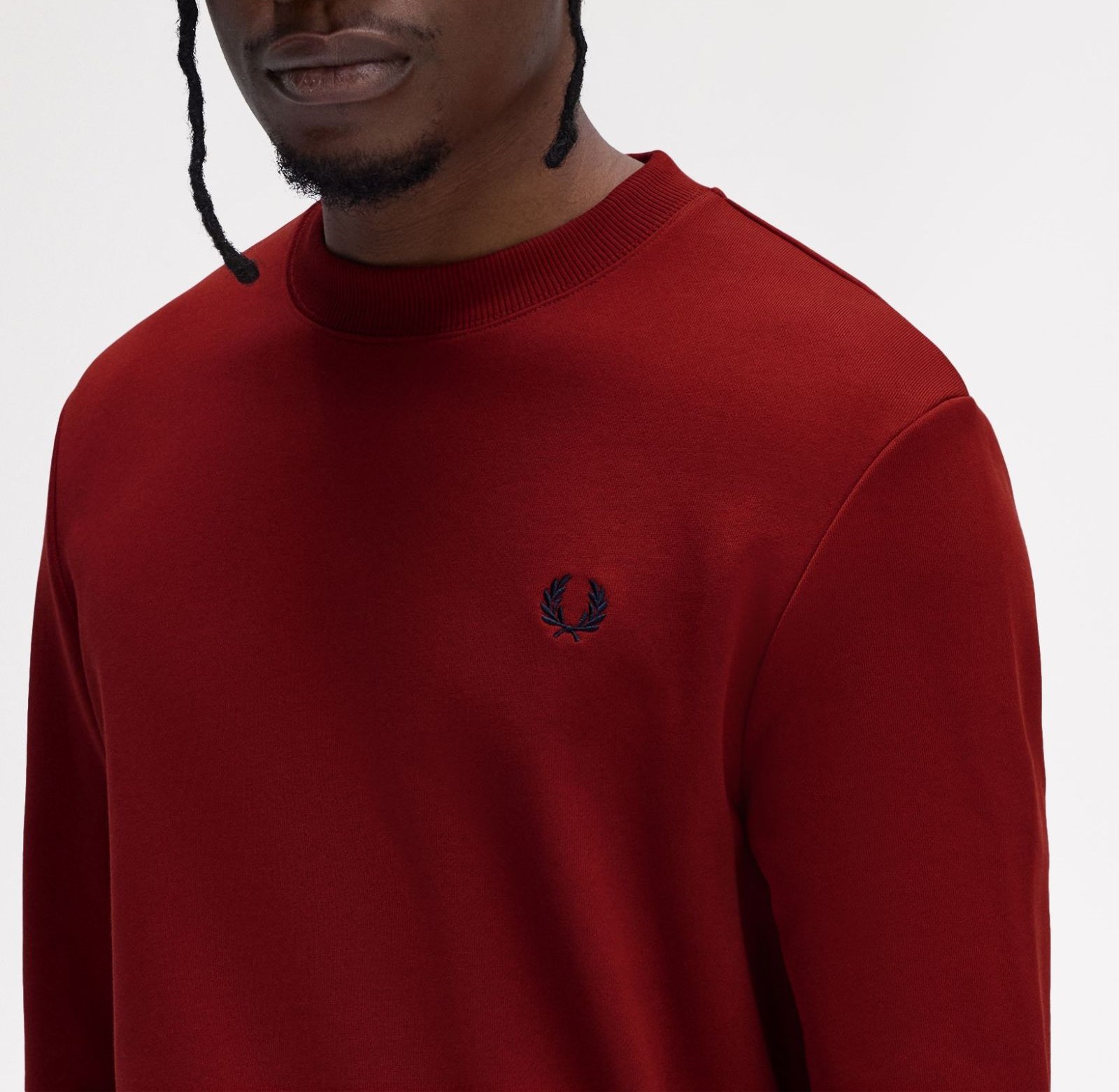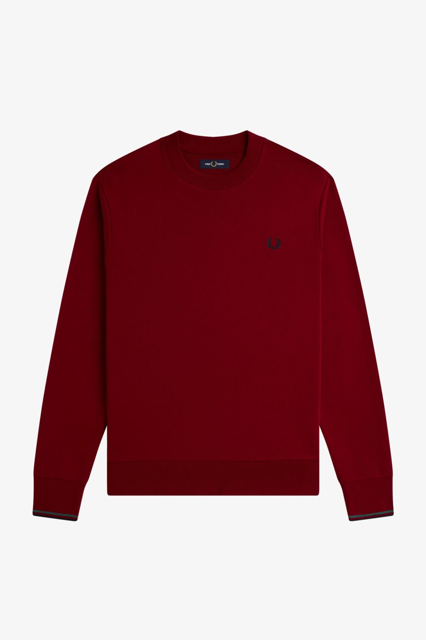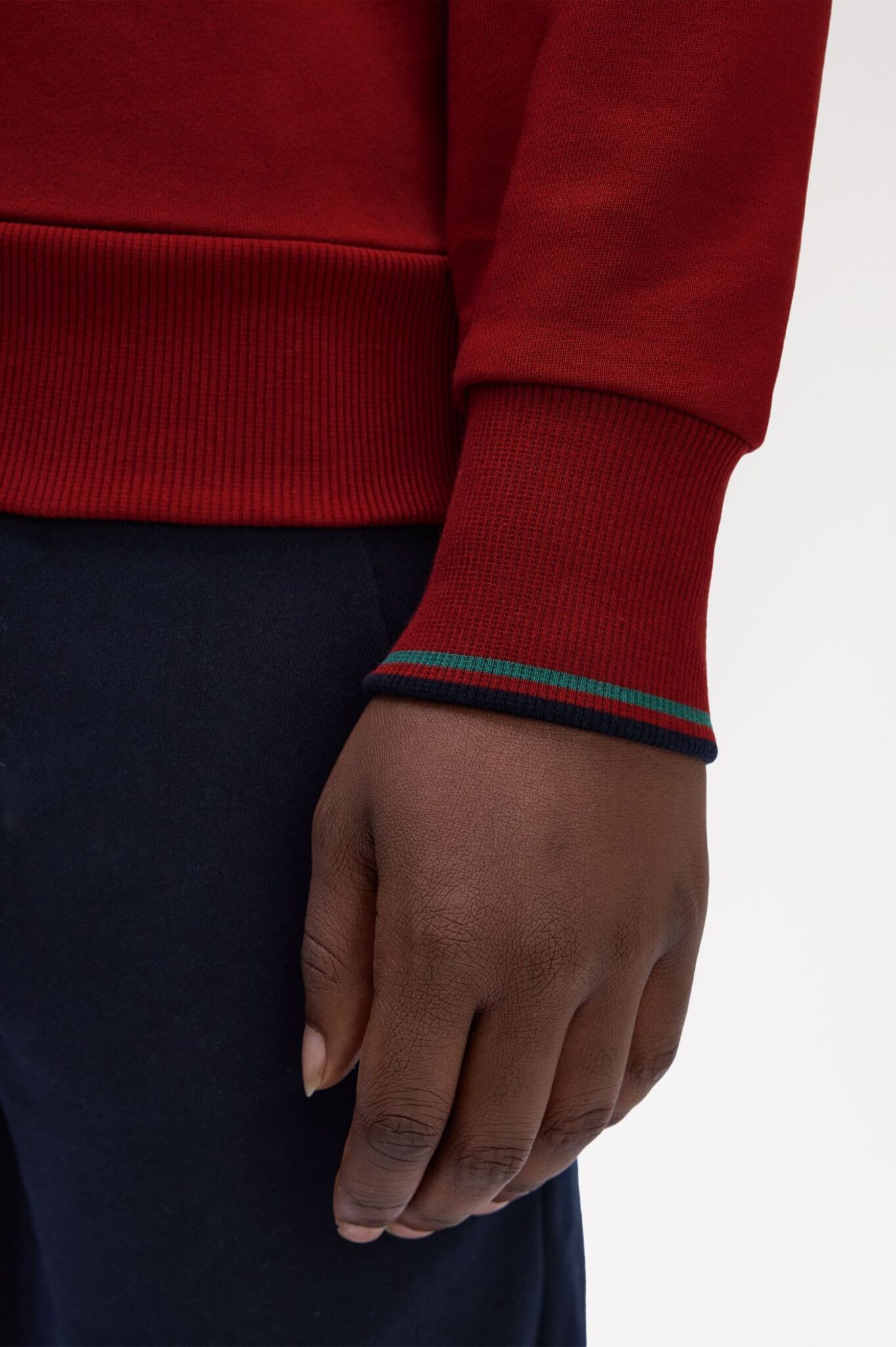 Fred Perry ανδρικό φούτερ σε κανονική γραμμή με στρογγυλή λαιμόκοψη και μανσέτες σε rib ύφανση για άνετη αίσθηση. Το φούτερ είναι σε κόκκινο σκούρο χρώμα και έχει μπλε λογότυπο στο πλάι, στις μανσέτες έχει λεπτομέρεια πράσινο και μπλε γραμμές.