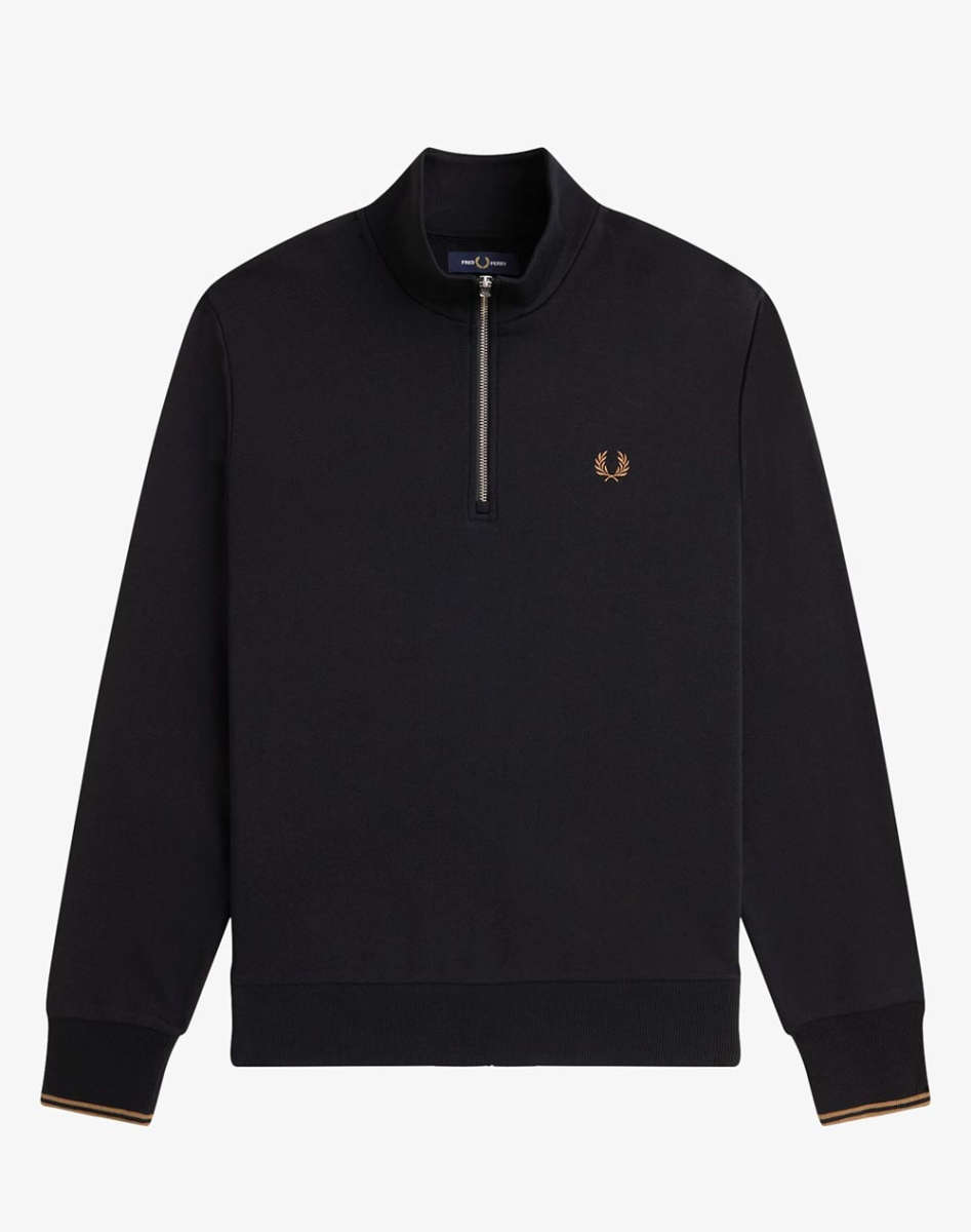 Fred Perry Half Zip φούτερ σε κανονική γραμμή με λεπτομέρειες στις μανσέτες, καφέ γραμμές και κεντημένο λογότυπο στο στήθος.