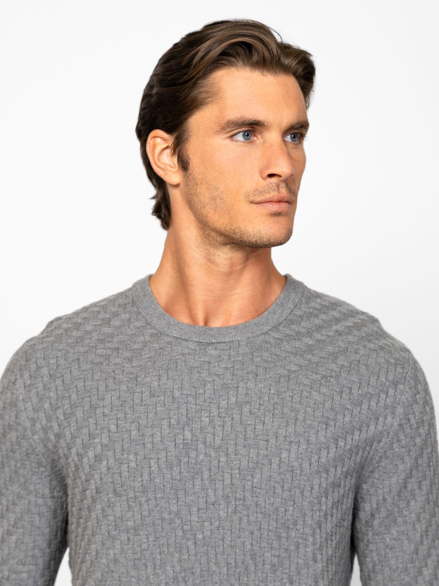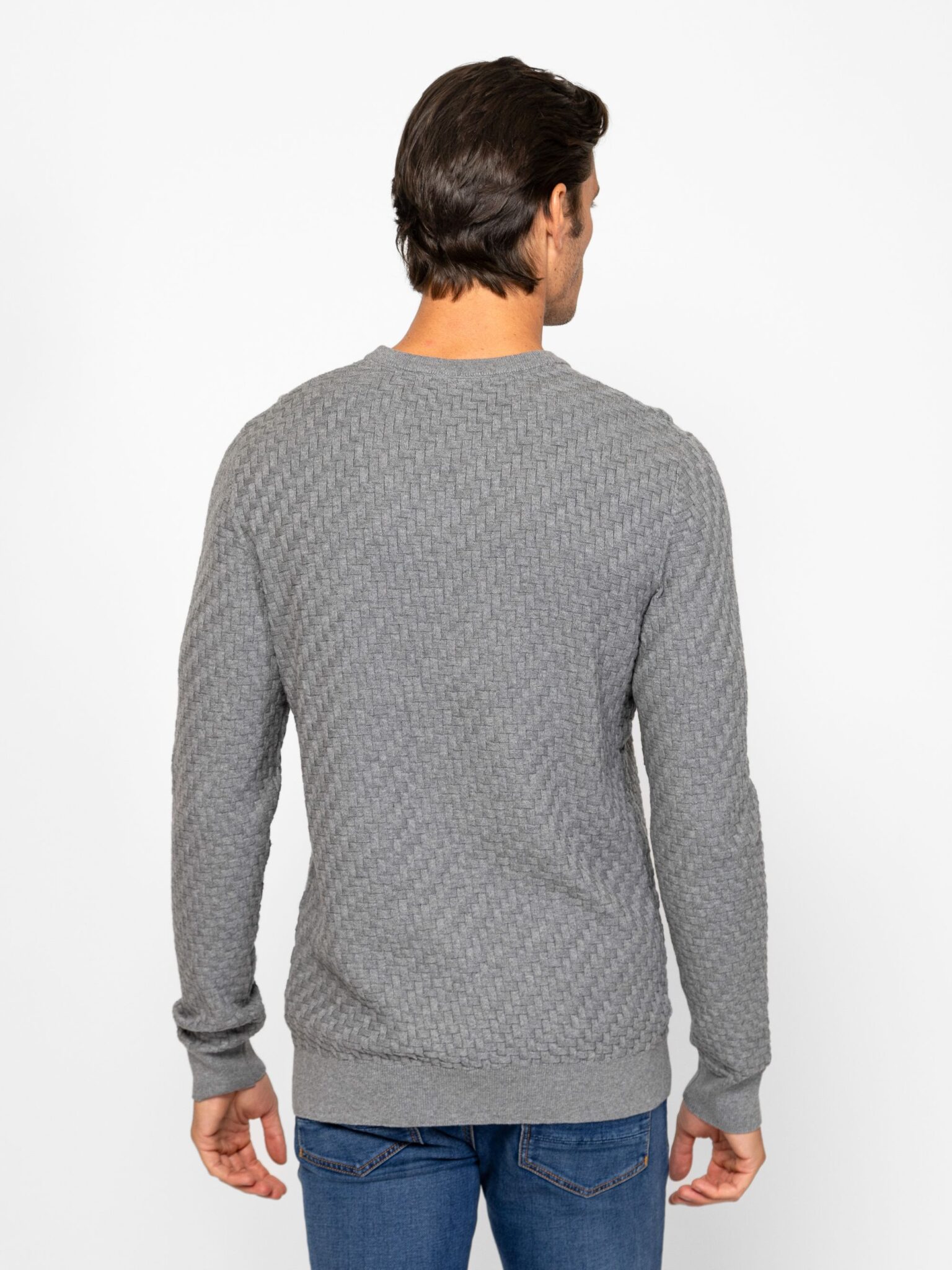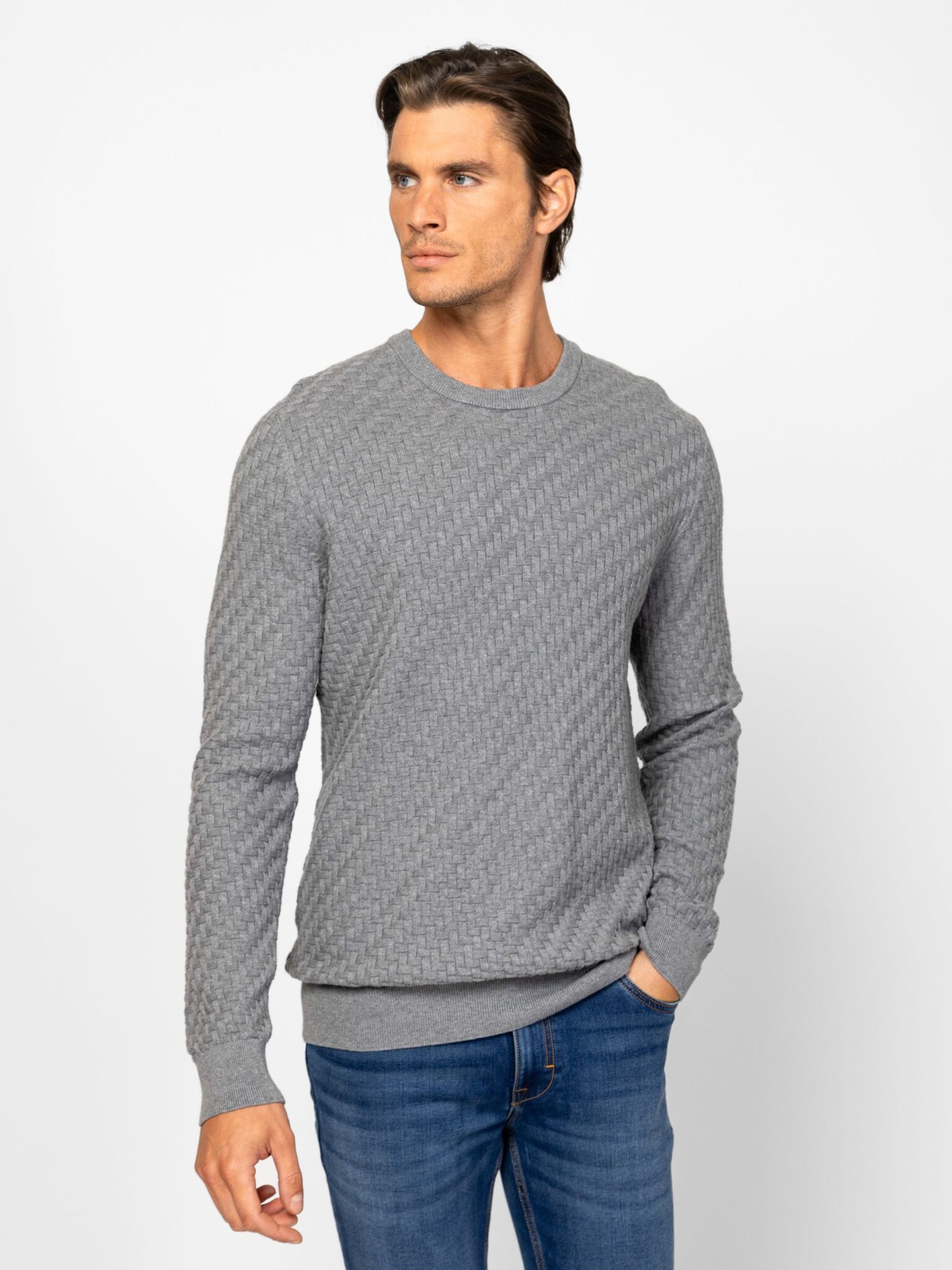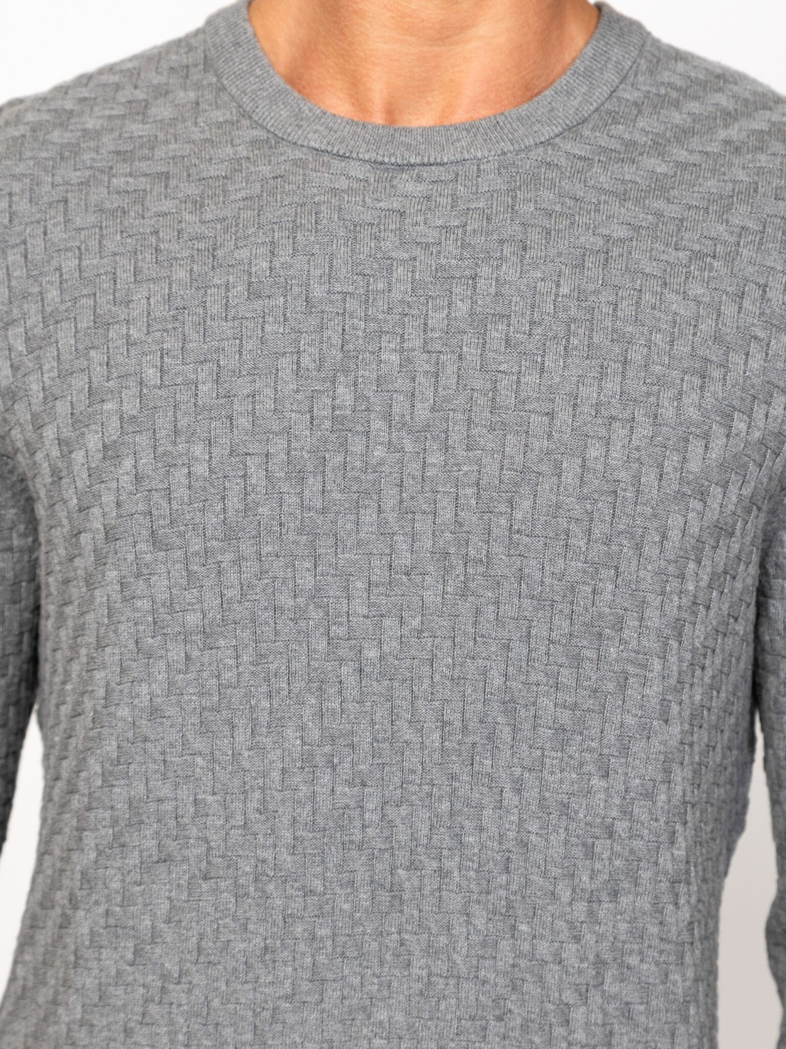 Heavy Tools ανδρικό πουλόβερ σε κλασική γραμμή με στρογγυλή λαιμόκοψη και ιδιαίτερη πλέξη. Έχει μικρό δερμάτινο λογότυπο σε καφέ απόχρωση στην κάτω αριστερή πλευρά.