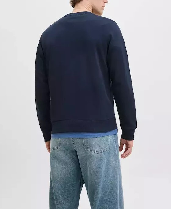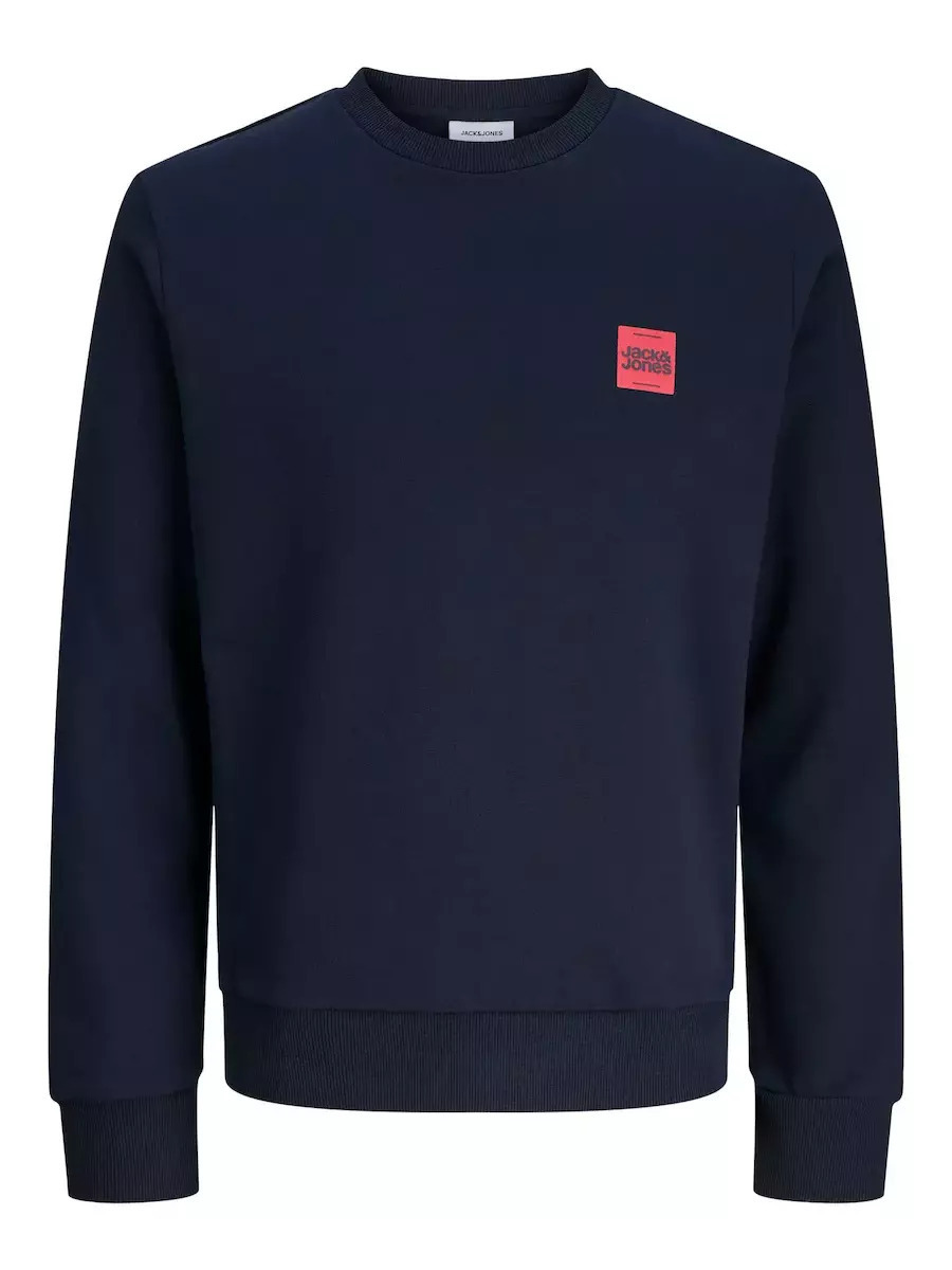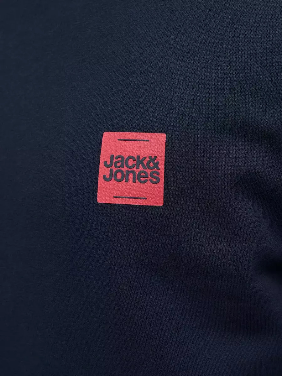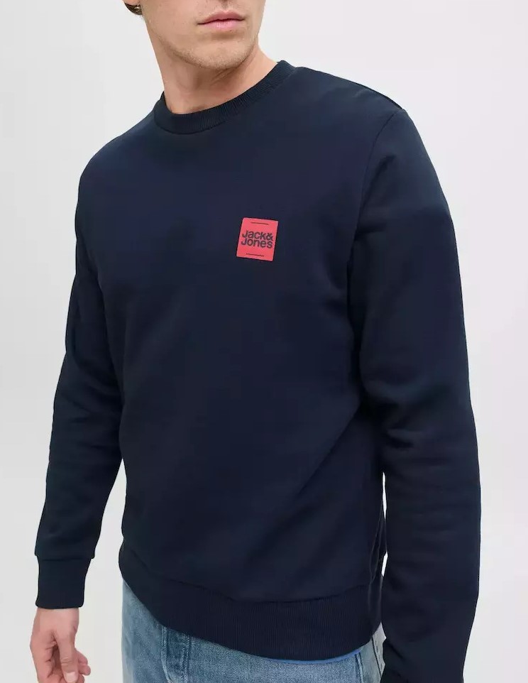 Jack & Jones ανδρικό φούτερ σε κανονική γραμμή με στρογγυλή λαιμόκοψη και μανσέτες σε rib ύφανση για άνετη αίσθηση. Το φούτερ είναι σε μπλε σκούρο χρώμα και έχει κόκκινο λογότυπο στο πλάι.