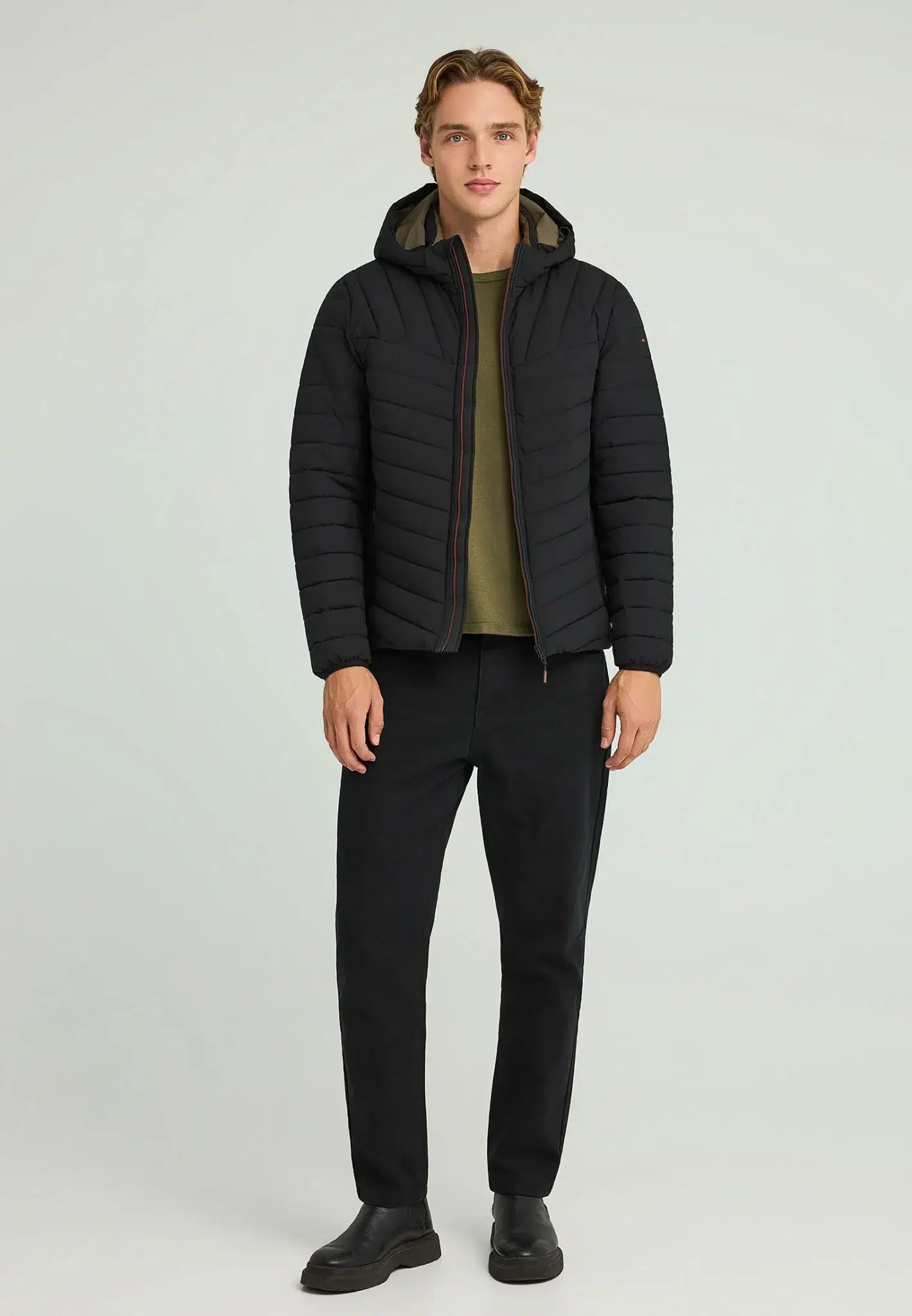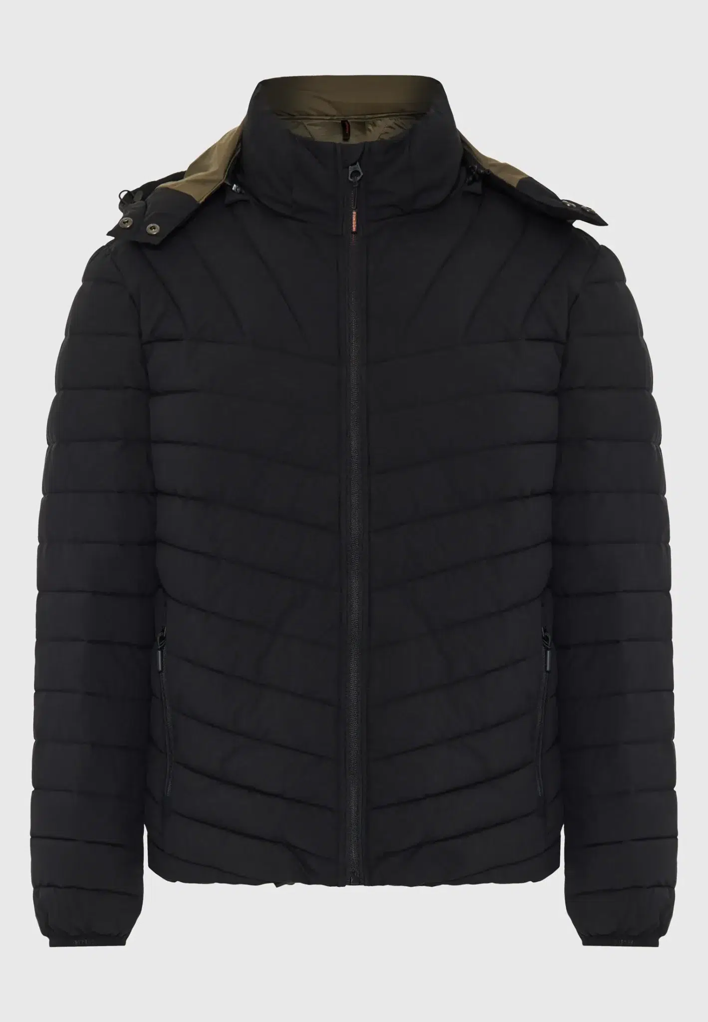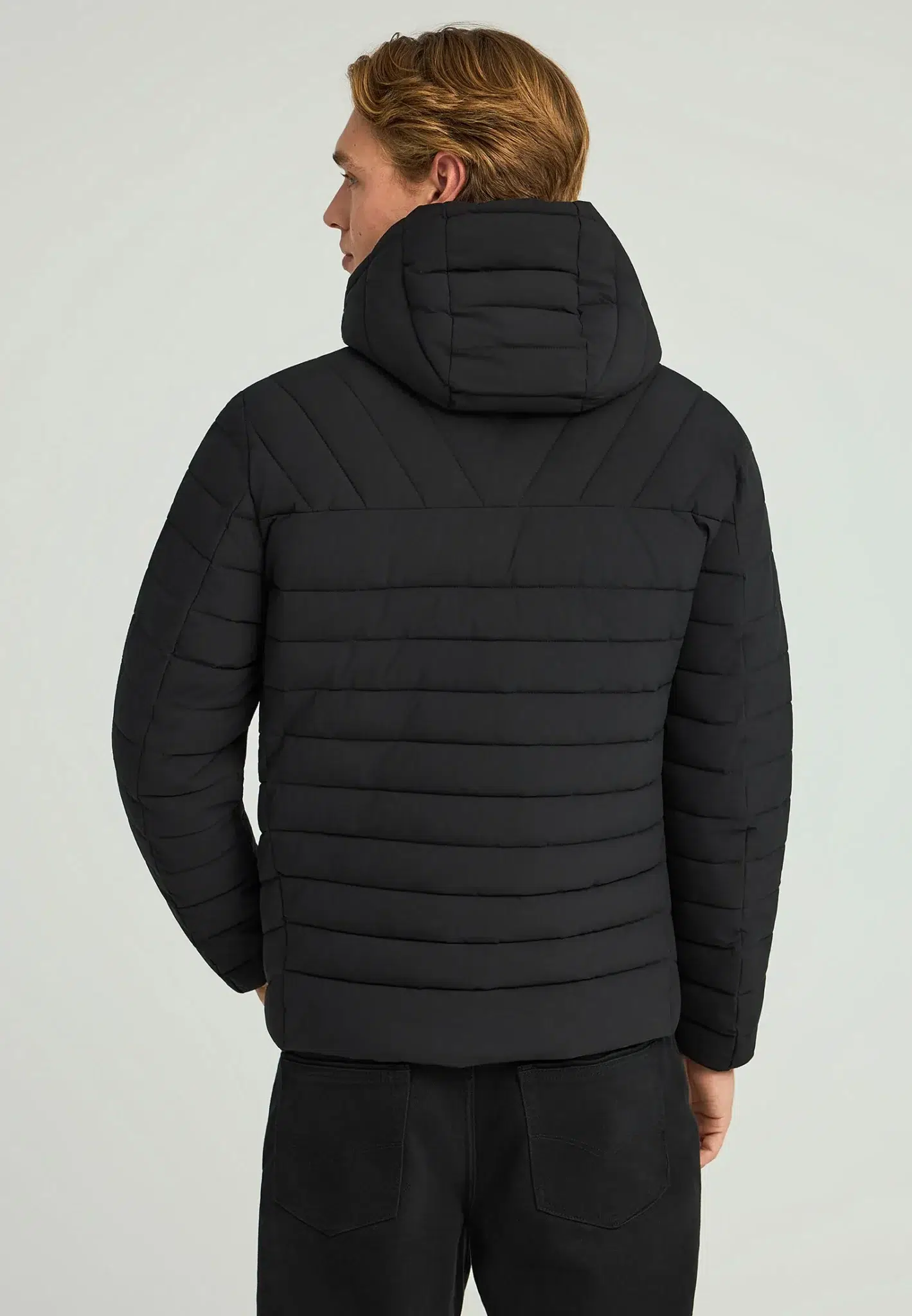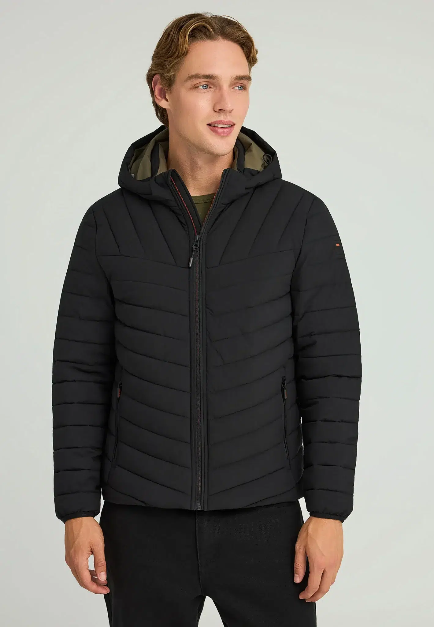 Ανδρικό μπουφάν με κουκούλα σχεδιασμένο για τις δραστηριότητες του φθινοπώρου και του χειμώνα. Έχει κανονική εφαρμογή με ψηλή λαιμόκοψη, οι τσέπες με φερμουάρ προσθέτουν πρακτικότητα και κλείσιμο με φερμουάρ. Κατασκευασμένο από ανθεκτικά συνθετικά υφάσματα και πολυεστέρα με καπιτονέ υφή, προσφέρει μοντέρνο look σε μονοχρωματική απόχρωση.