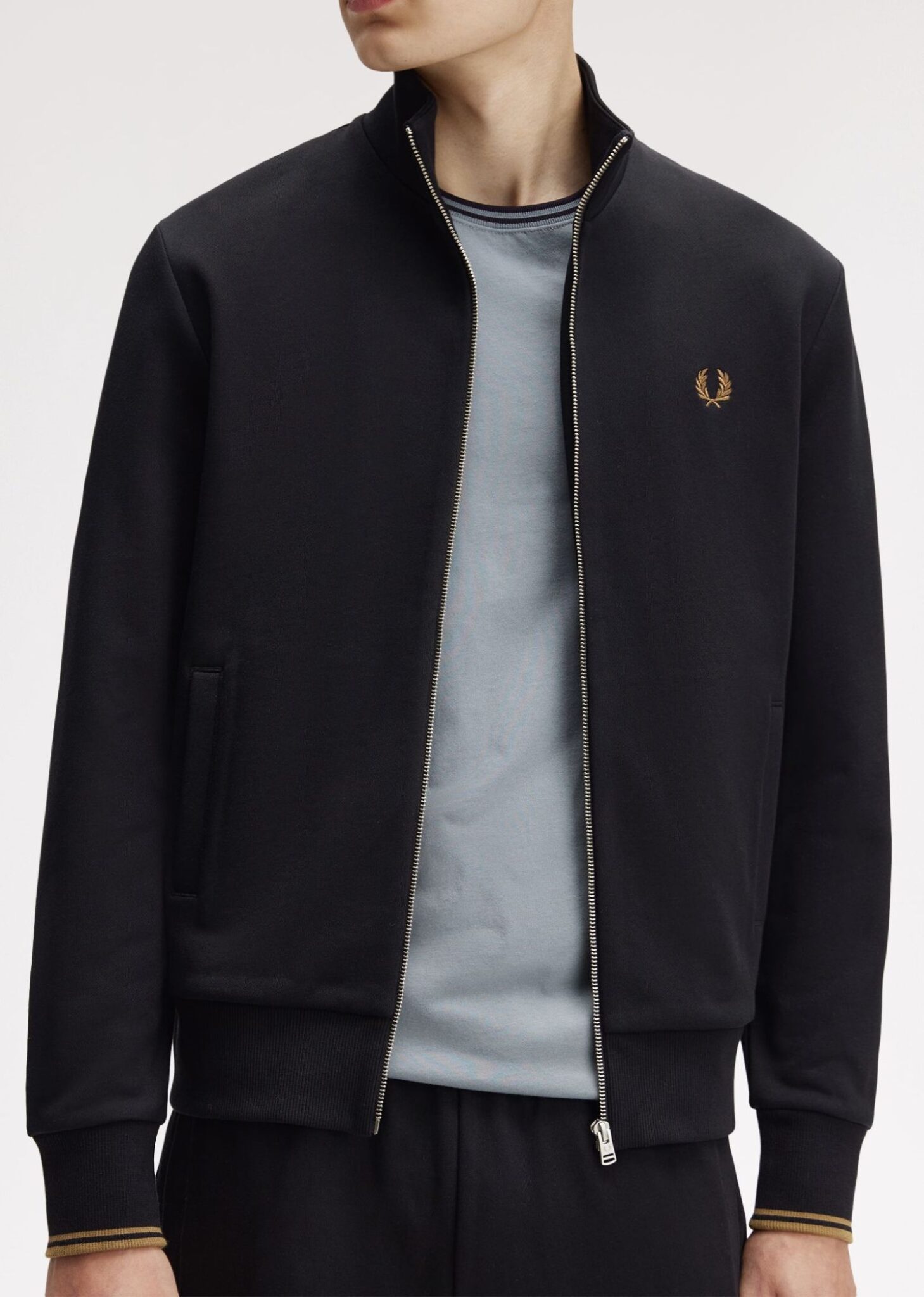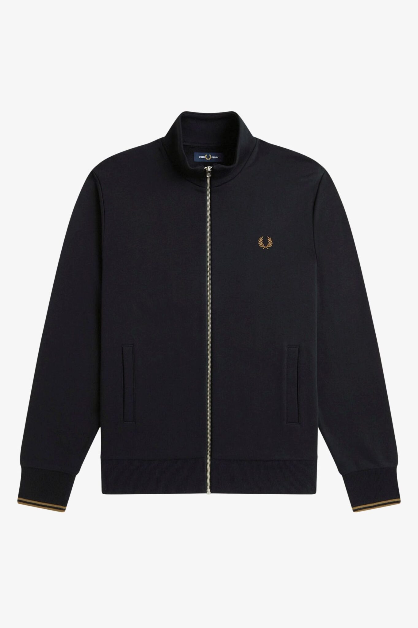 Fred Perry ανδρική εξαιρετικής ποιότητας μονόχρωμη φούτερ ζακέτα, κατασκευασμένο από 100% βαμβάκι. Η ζακέτα είναι σε κλασσική γραμμή που προσφέρει άνεση και στυλ στην καθημερινή εμφάνιση σας. Διαθέτει μακριά μανίκια με ριμπ μανσέτες με καφέ γραμμές στο τελείωμα και κεντητό καφέ διακριτικό logo μπροστά.