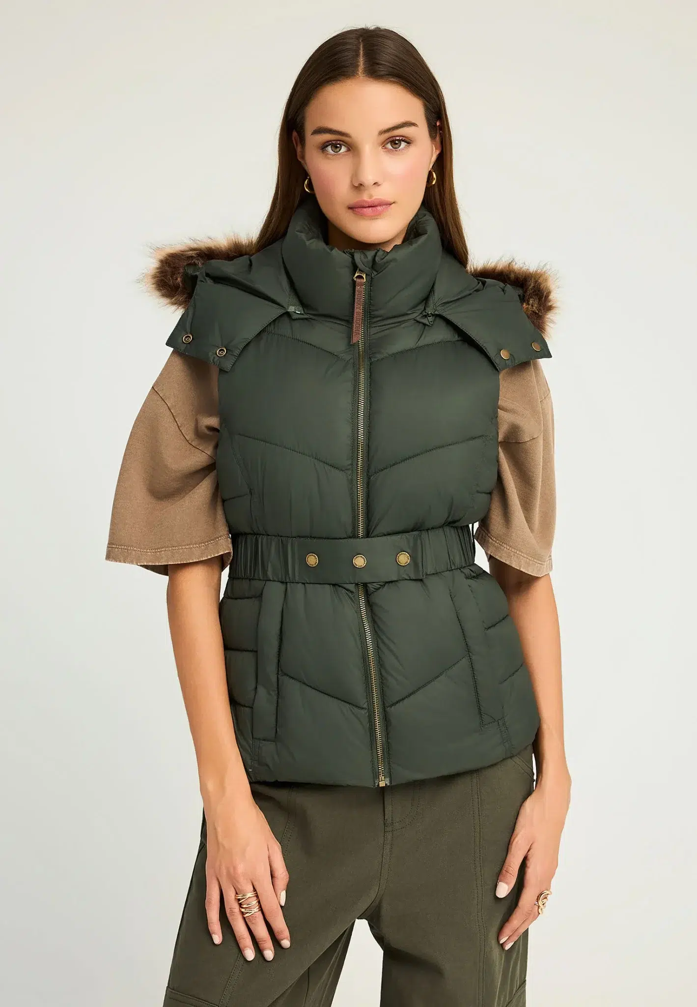 Ανακάλυψε το απόλυτο αμάνικο καπιτονέ μπουφάν που συνδυάζει άνεση και σύγχρονο στυλ. Σχεδιασμένο σε κανονική γραμμή, προσφέρει ζεστασιά χωρίς βάρος, ιδανικό για τις φθινοπωρινές και χειμερινές εξορμήσεις σου. Η funnel λαιμόκοψη με κουκούλα γούνας χαρίζει cozy αίσθηση και premium χαρακτήρα, ενώ οι πρακτικές welt τσέπες και το φερμουάρ ολοκληρώνουν το λειτουργικό design. Με μήκος έως τους γοφούς και minimal μονόχρωμο look, γίνεται το ιδανικό layering κομμάτι για urban περιπέτειες.