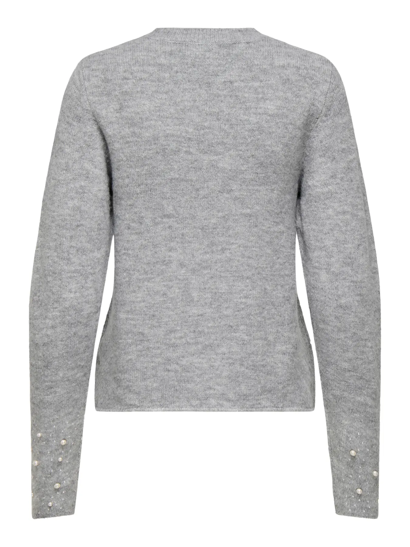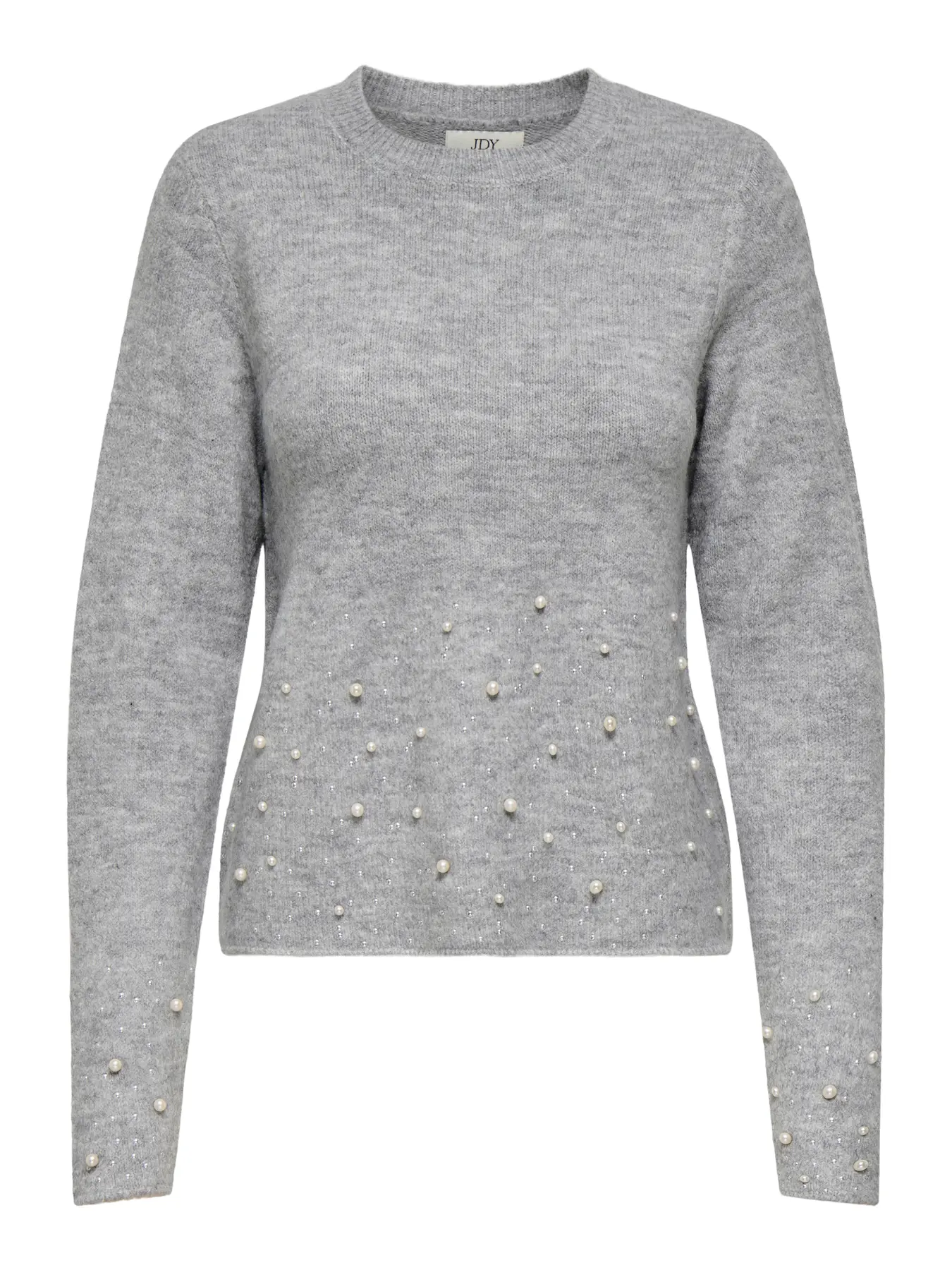 JDY Pearl γυναικείο πλεκτό πουλόβερ με στρογγυλή λαιμόκοψη και λευκές πέρλες στην κάτω μπροστινή επιφάνεια και κάτω στα μανίκια.