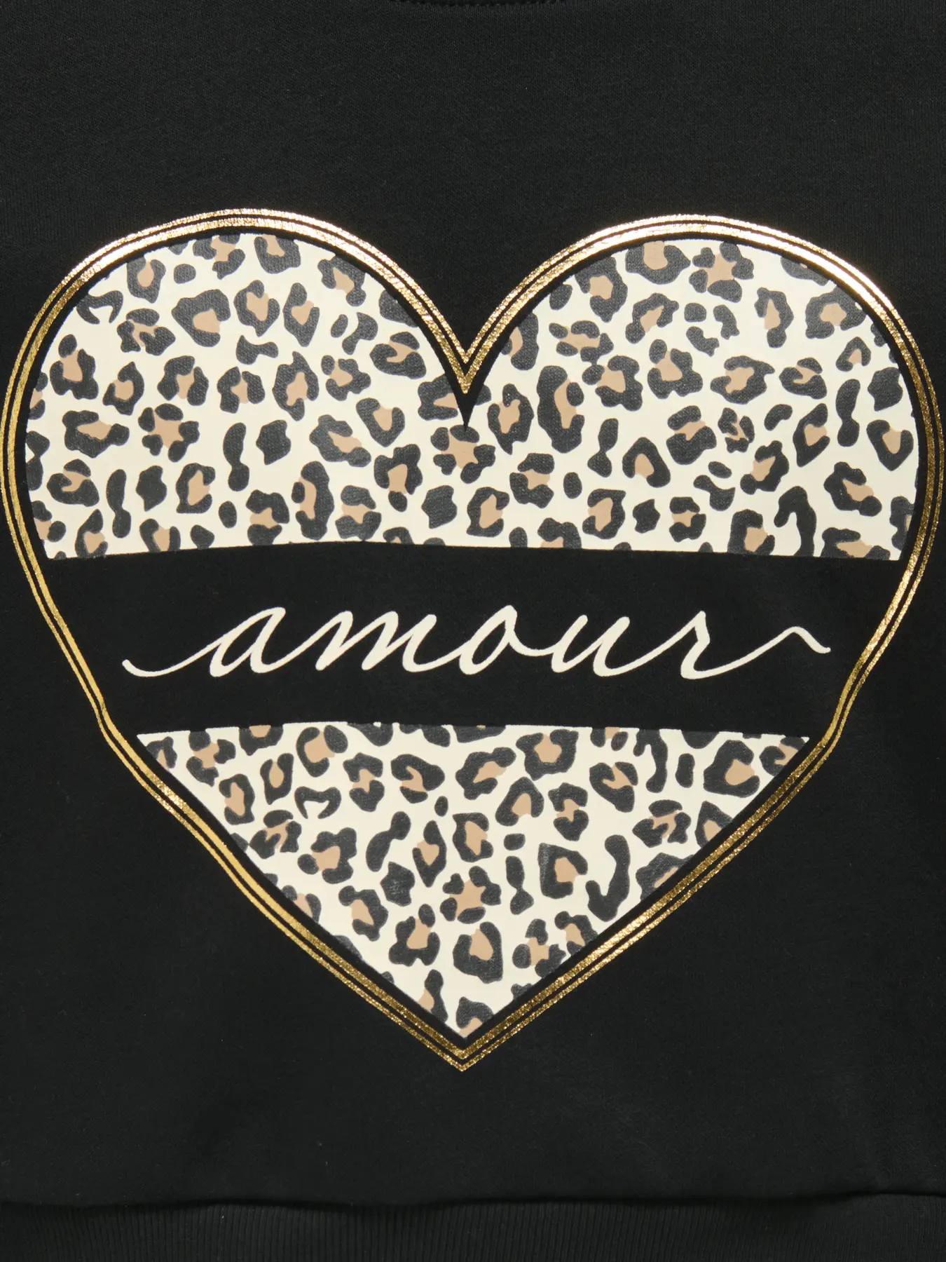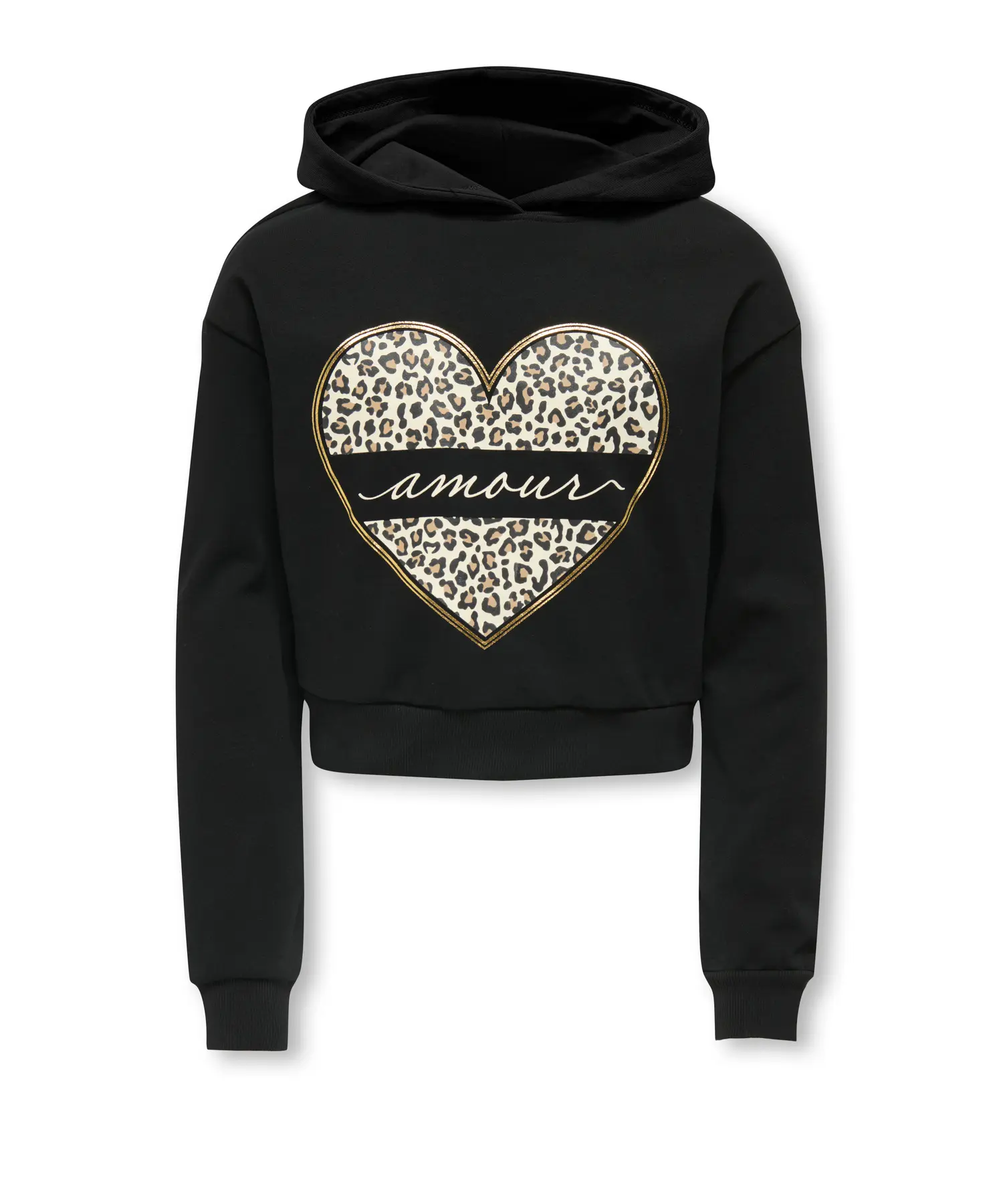 Κοριτσίστικο φούτερ με κουκούλα της εταιρίας Only με τυπωμένη καρδιά μπροστά και animal print και λεπτομέρειες.