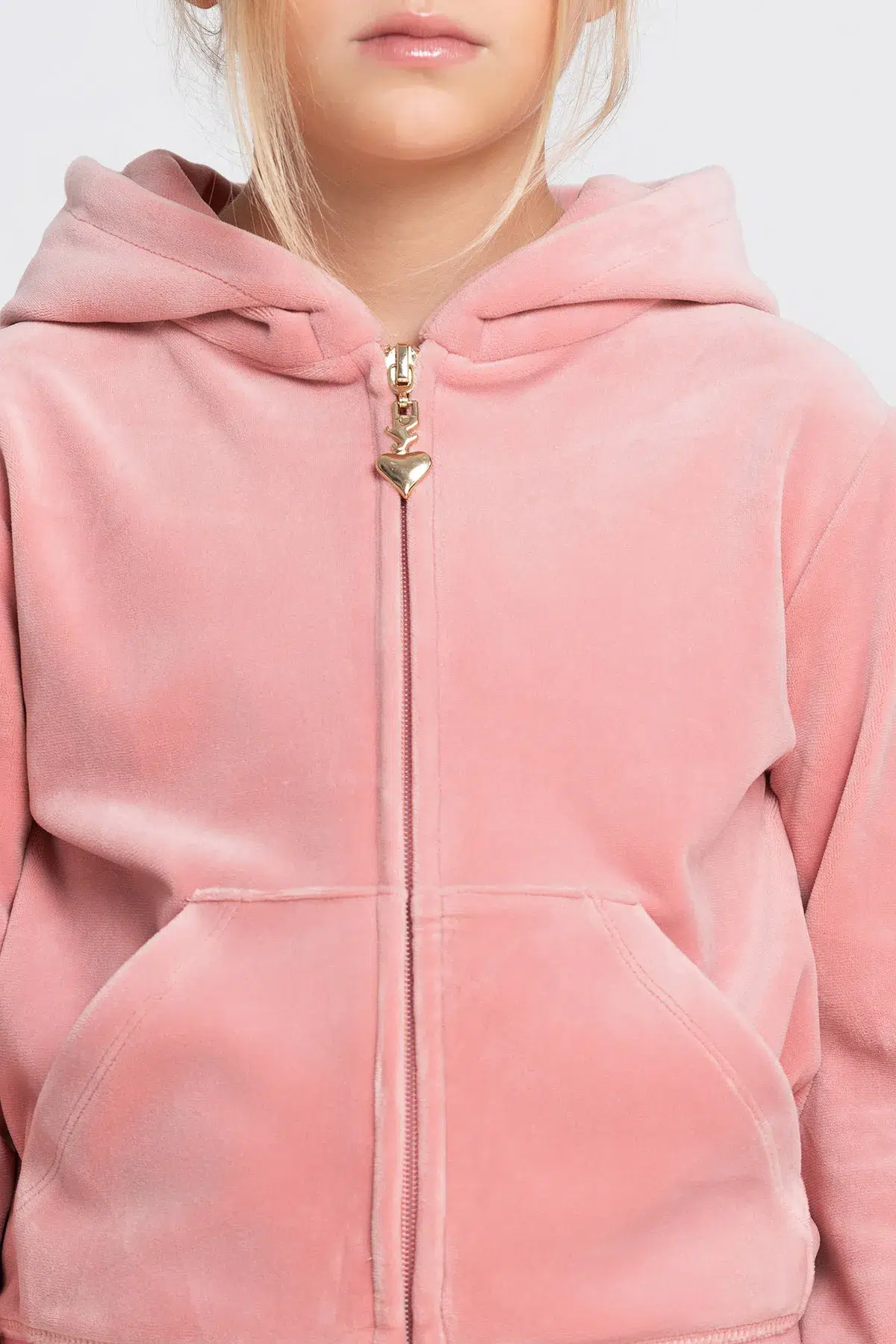 Παιδικό μονόχρωμο super soft shiny βελουτέ σετ φόρμας. Ζακέτα με κουκούλα σε μονόχρωμο στυλ. Διαθέτει φερμουάρ με χρυσό λογότυπο στο μπροστινό μέρος, λάστιχο στη μέση και τα μανίκια και δύο τσεπάκια μπροστά. Παντελόνι σε ίσια γραμμή με λάστιχο στον αστράγαλο. Διαθέτει λάστιχο στη μέση για σταθερή εφαρμογή και SF λογότυπο στο πλάι.